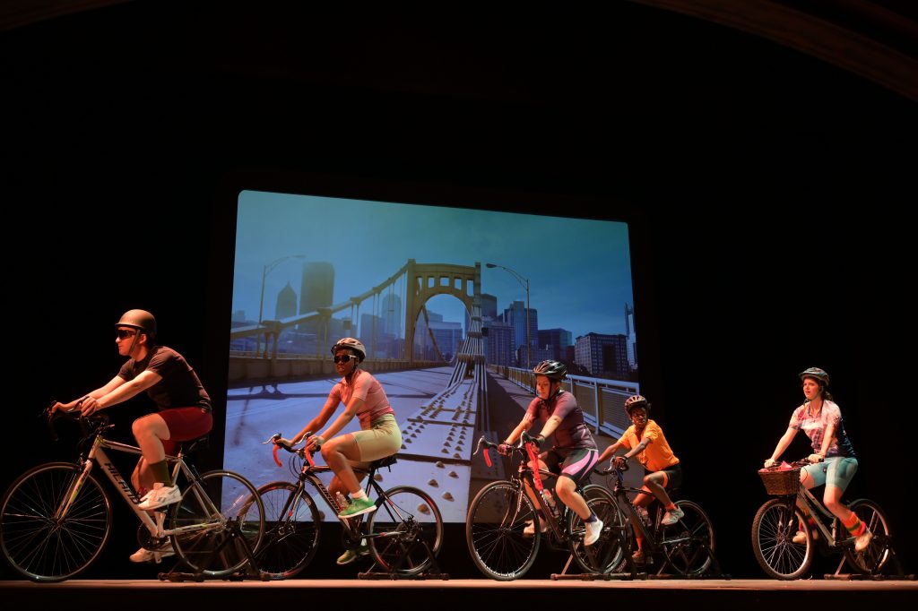 Kalski acknowledged the challenge of having actors on bikes that are both stationary and in-motion. The cast had to transition between acting like they were biking and not biking to assure they could be heard. She described the end result as “surrealist” and said, “If two characters have to have a conversation and their bikes are across the stage, someone just hops off their bike and walks over. They’re still biking but they can walk also. I really like it, and I think it’s pretty fun.”