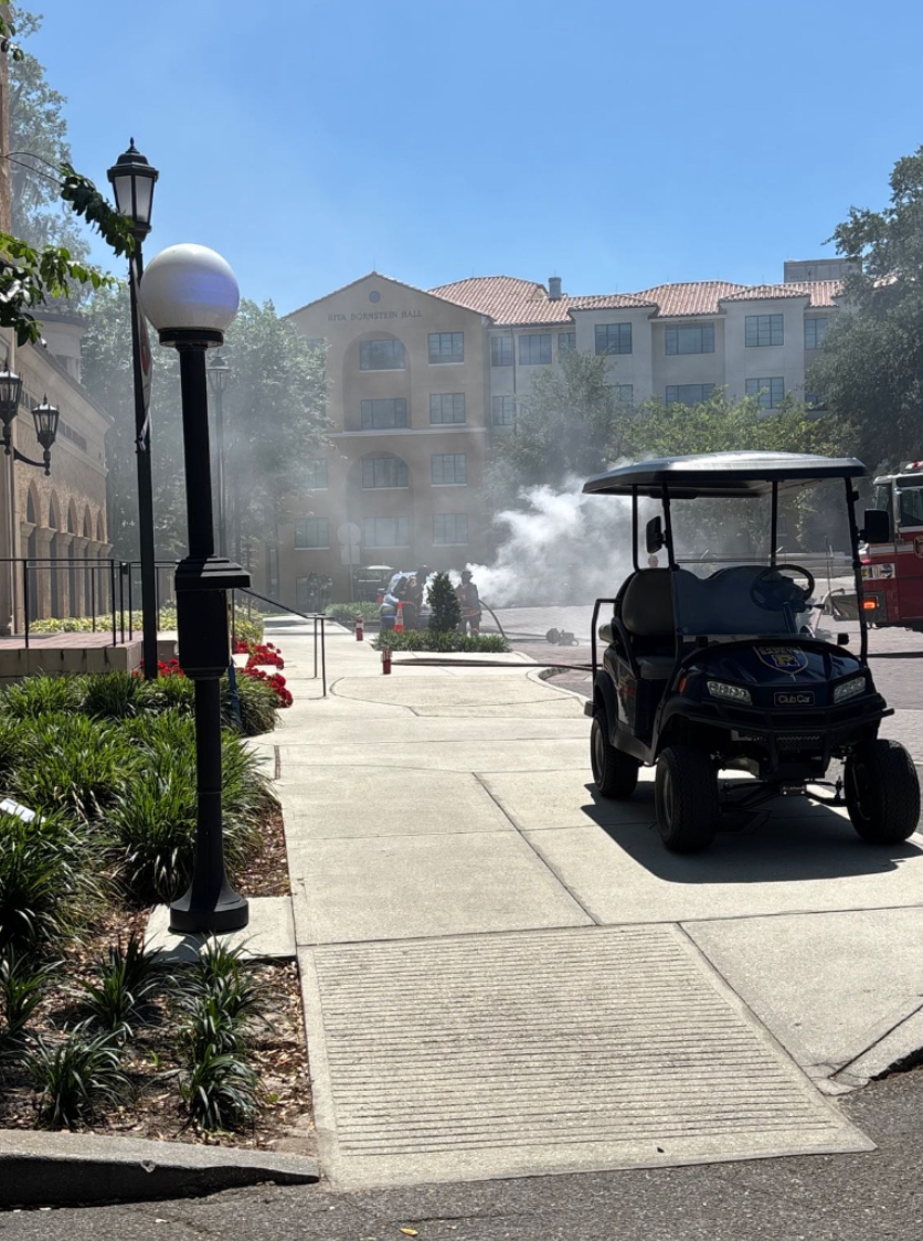 Miller went on to explain that an officer from Campus Safety noticed this smoke shortly after it began, at which point he contacted the dispatch officer to contact the Winter Park Fire Department (WPFD). By the seven-minute mark, WPFD had arrived and put out the fire, which Miller said caused heavy smoke to fill the area.