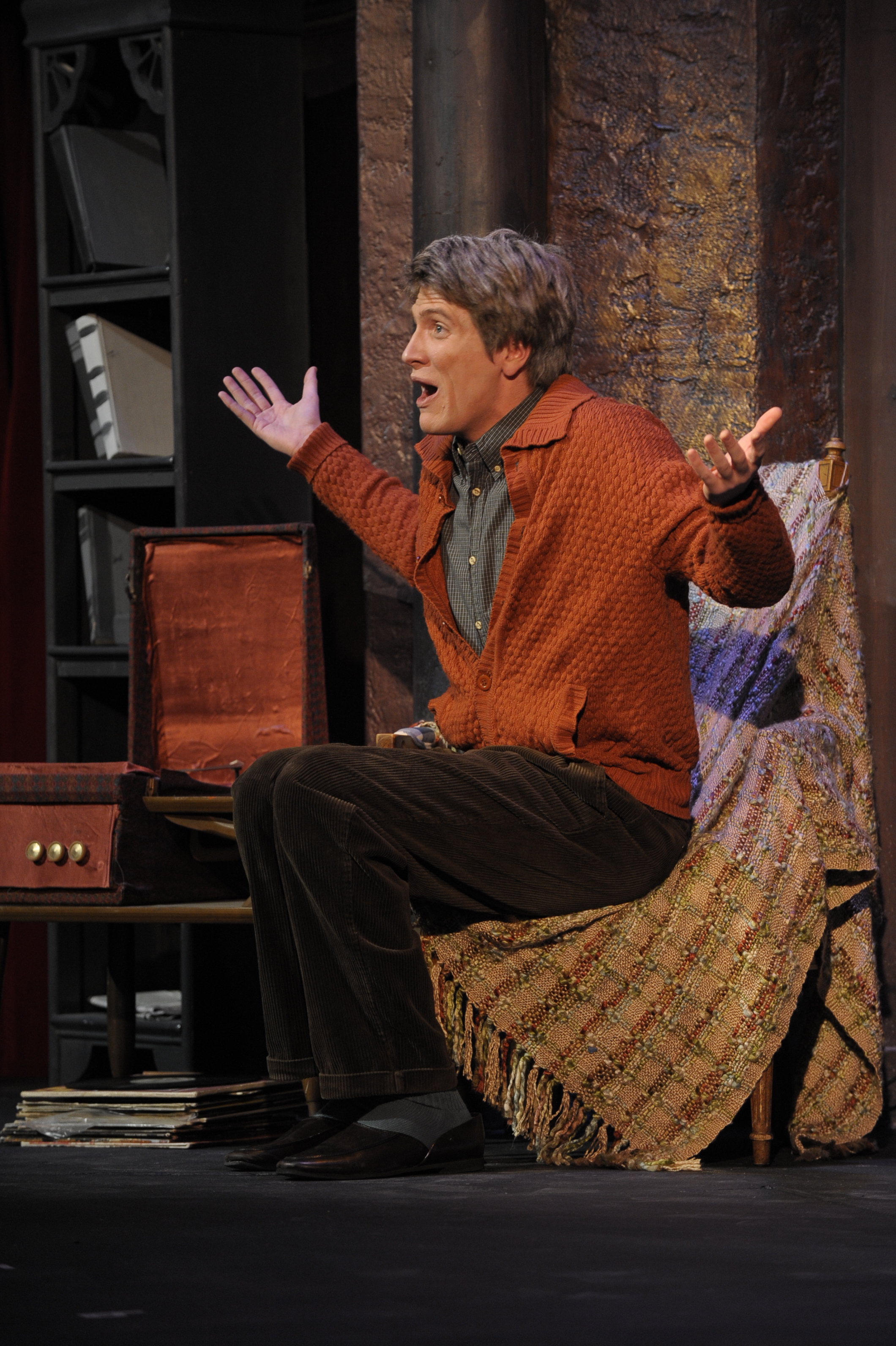 The play commences with the character of Man in Chair, played by Ryan Lambert ‘13, who uses modern technology to imply the sanctity and beauty of musicals Throughout the play, he adds a sense of humor and relief from the play, bringing the audience back from the musical world and enabled them to witness technology’s overwhelming influence over today’s society. Man in Chair constantly struggles to remove himself from the present constraints of society, symbolized by his incessantly ringing phone; however, he ultimately succeeds in overcoming the technological constraints of modern society by wrenching his phone from its outlet, allowing himself to be transported “to another world, [which is] what a musical is supposed to do.”
