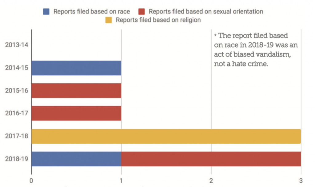 Since 2016, there has been a steady increase in hate crimes on campus. Spring and fall of 2016 saw only two hate crimes reported, and then spring 2017 saw three in just five weeks. A similar wave has struck campus again, as two hate crimes and one act of racist vandalism have been reported this semester.