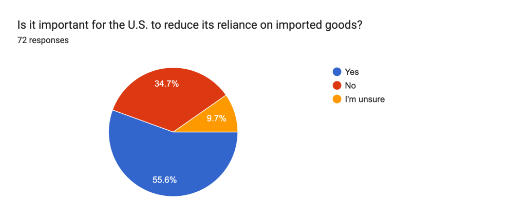 One respondent said, “I think it is important for the US to weaken its reliance on imported goods, but we do not currently have the infrastructural capacity to supply our own goods (through physical labor, factories, means of production, etc.).”